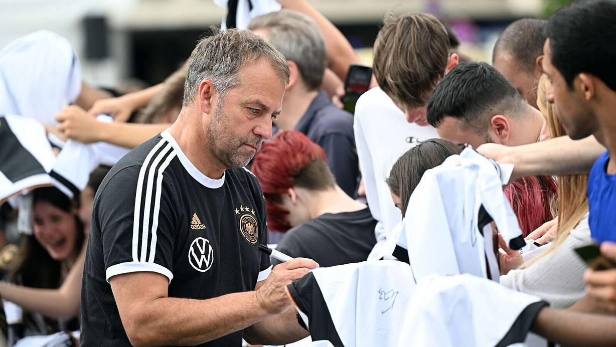 Ein Jahr vor dem Auftakt der Fußball-EM in Deutschland haben Bundestrainer Hansi Flick und die Nationalspieler Leroy Sané, Emre Can und Kevin Trapp nach zuletzt durchwachsenen Vorstellungen bei den Fans ein wenig Werbung in eigener Sache betrieben.
