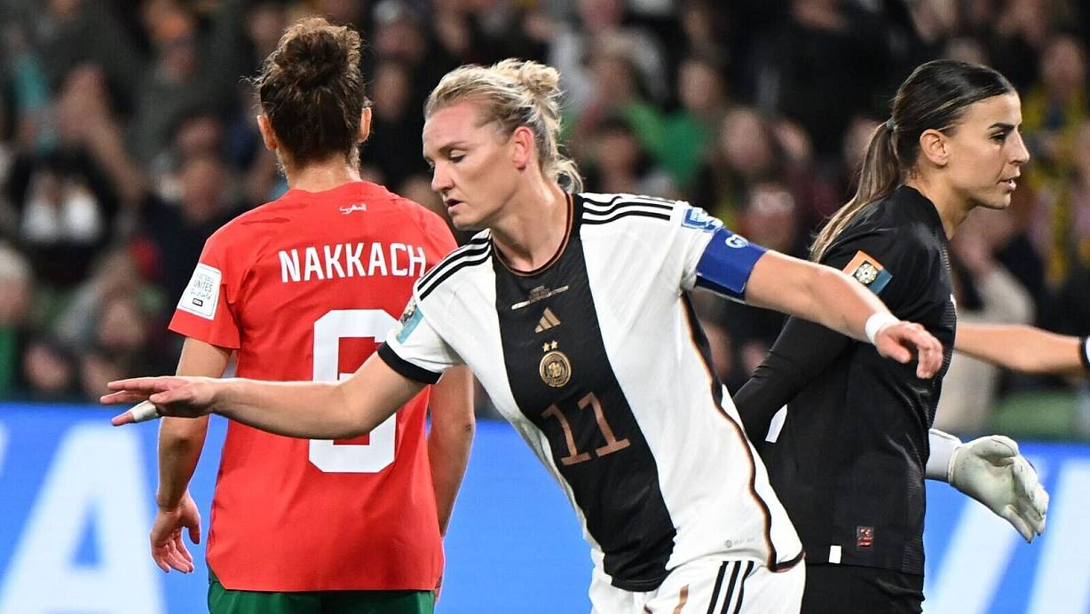 Alexandra Popp trägt beim ersten WM-Spiel der deutschen Fußballerinnen in Australien wie angekündigt eine Kapitänsbinde, die auf das Thema Gewalt gegen Frauen aufmerksam macht.