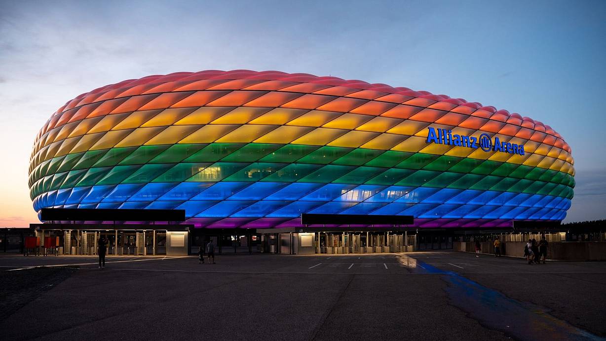 Nicht in Pink, aber in Regenbogenfarben leuchten wird in diesen Tagen auch die Münchner Arena. Als Symbol für die Akzeptanz und Gleichberechtigung von Menschen, die sich nicht mit dem traditionellen Rollenbild von Mann und Frau oder anderen Normen rund um Geschlecht und Sexualität identifizieren, werden die Farben am Stadion am 22. und 23. Juni zu sehen sein. Anlass ist aber der Christopher Street Day - ein EM-Spiel wird an den beiden Tagen in München nicht ausgerichtet.