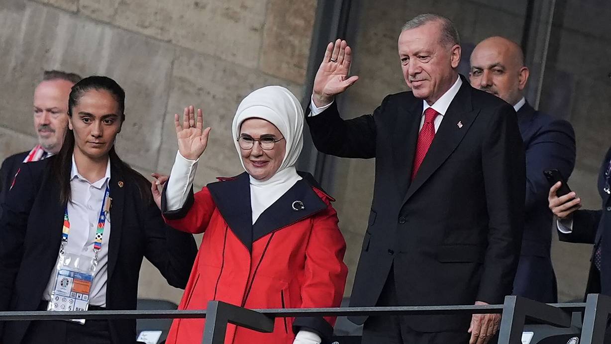 Der türkische Präsident Recep Tayyip Erdogan ist wie angekündigt nach Berlin gereist, um nach dem Wolfsgruß-Eklat seinem Team im EM-Viertelfinale gegen die Niederlande den Rücken zu stärken. Im dunklen Anzug und mit roter Krawatte saß der 70-Jährige zusammen mit Ehefrau Emine im Berliner Olympiastadion auf der Tribüne.