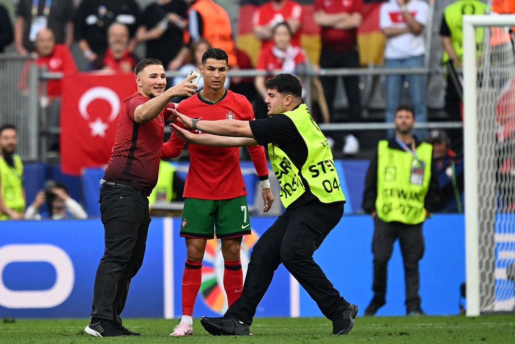Ein Selfie mit Cristiano Ronaldo: Mit diesem Ziel stürmten mehrere Fans bei der EM auf den Platz und sorgten für verrückte Szenen. Besonders kurios wurde es beim 3:0 der Portugiesen gegen die Türkei. Mehrmals sah sich der Superstar schon während des Spiels mit Selfie-Jägern konfrontiert. Nach dem Abpfiff probierten es weitere Anhänger.
