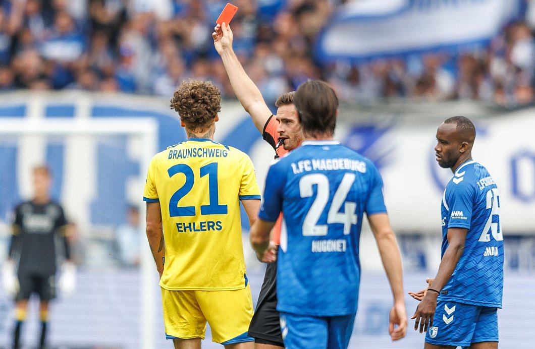 Eintracht Braunschweig hat trotz Unterzahl sein Auftaktspiel in der 2. Fußball-Bundesliga beim 1. FC Magdeburg gewonnen. Im Nachbarschaftsduell setzten sich die Niedersachsen vor 28.780 Zuschauern mit 1:0 (0:0) durch. Das sehenswerte Siegtor erzielte Mehmet Aydin (82. Minute). Zuvor hatte sein Mitspieler Kevin Ehlers die Rote Karte gesehen (54.)