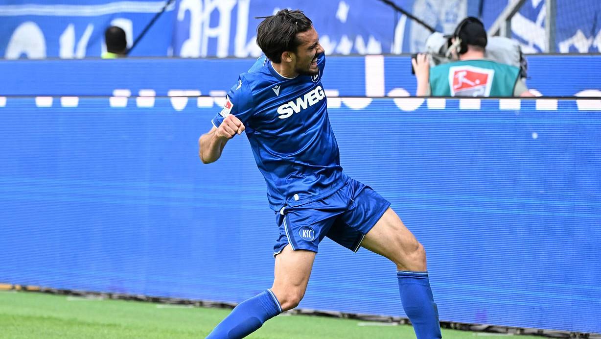 Karlsruhes Roko Simic bejubelt das 1:0. | © Uli Deck/dpa