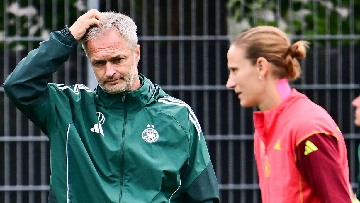 Was tun in der Torfrau-Frage? DFB-Trainer Christian Wück (l.) und Stammkeeperin Ann-Katrin Berger. | © Sebastian Christoph Gollnow/dpa