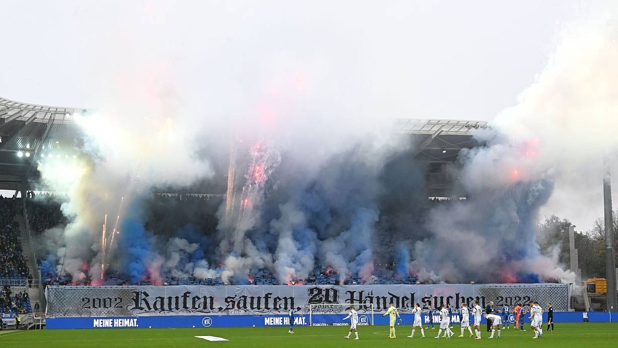 Diese Pyro-Aktion von Fans des Karlsruher SC im November 2022 hatte ein juristisches Nachspiel. | © Uli Deck/dpa