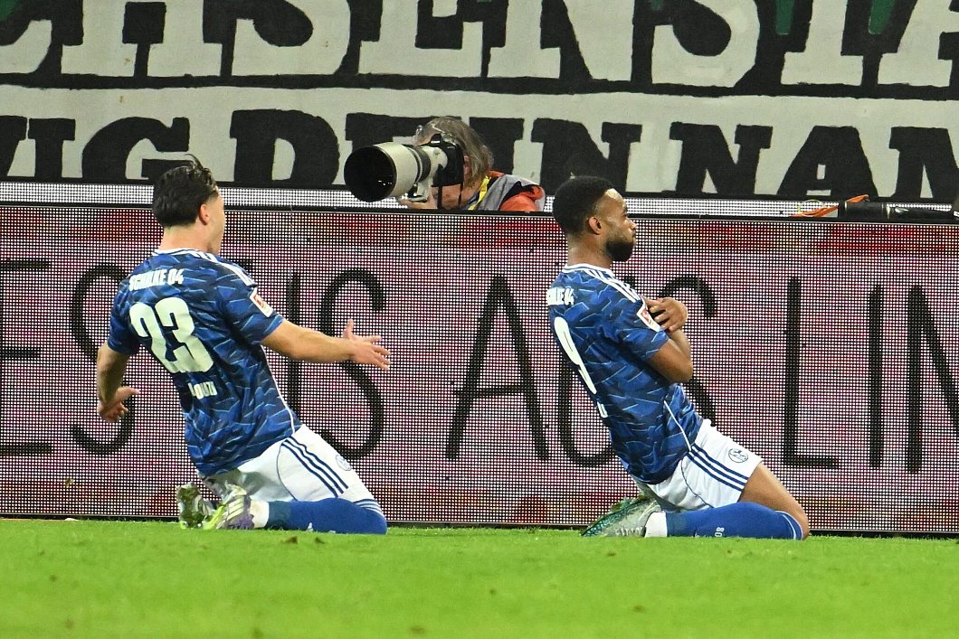 Jubelt nach seinem zweiten Streich: Moussa Sylla (r) von Schalke 04. | © Swen Pförtner/dpa