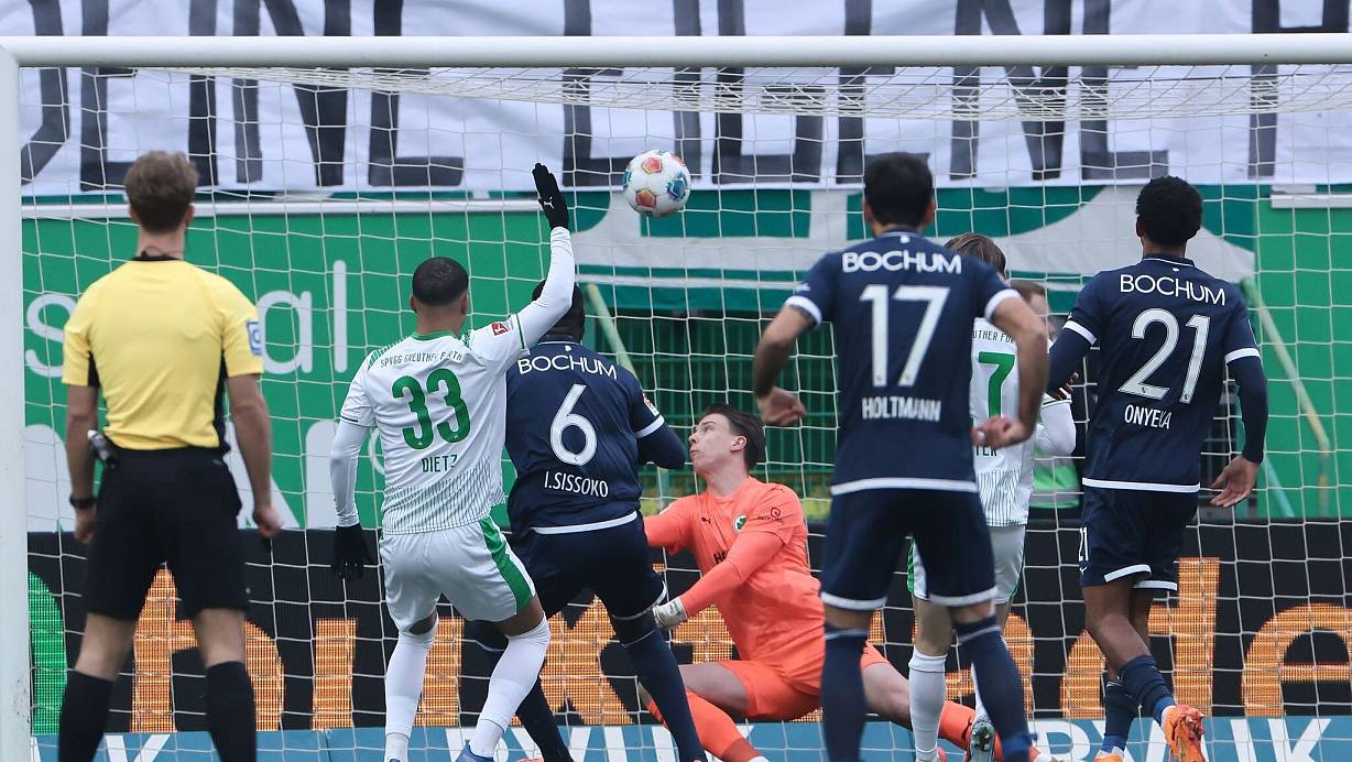 Ibrahima Sissoko (Nr. 6) schießt den Ball zum Bochumer 1:0 ins Fürther Tor. | © Daniel Löb/dpa