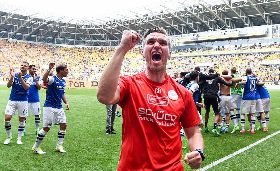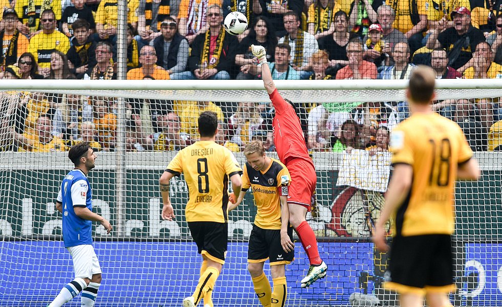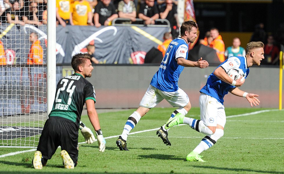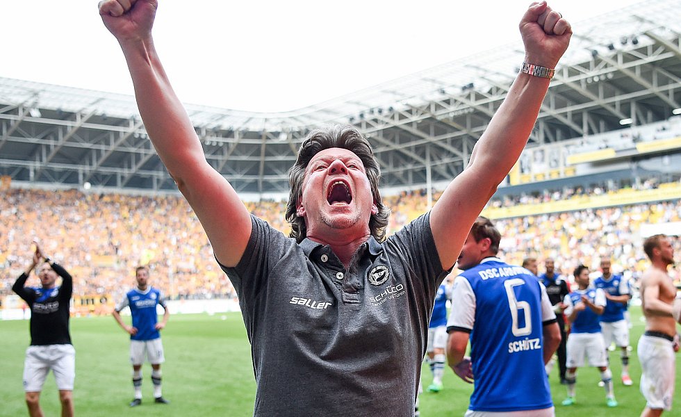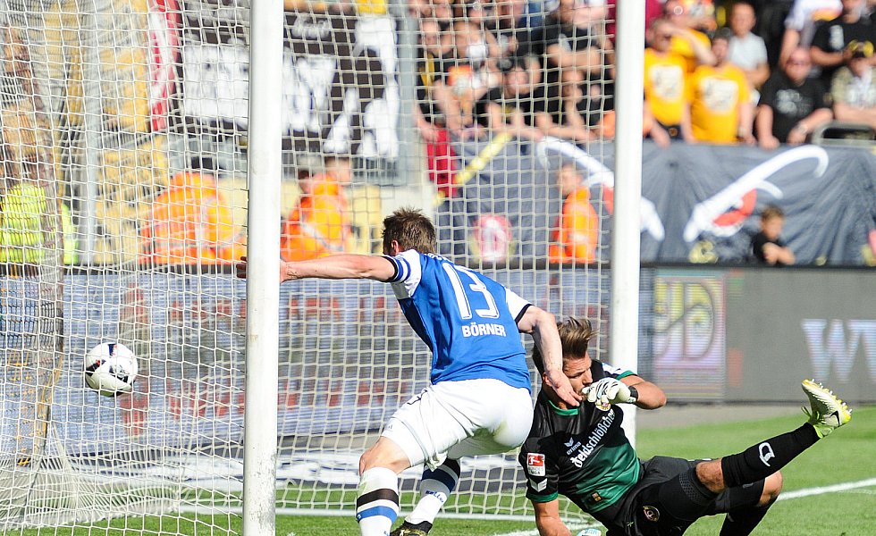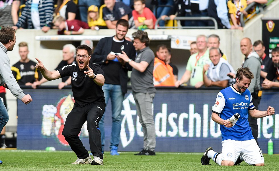 Nach 84 Minuten musste dann mal wieder ein Standard herhalten: Julian Börner sorgte per Kopf nach einem Schütz-Freistoß für den mittlerweile verdienten Ausgleich, nachdem Dresdens Abseitsfalle misslang. Dennoch benötigten die Arminen nach wie vor einen Sieg, da 1860 München parallel in Heidenheim mit 0:1 in Front lag. Dynamo-Keeper Wiegels lenkte einen Putaro-Schuss drei Minuten vor Ablauf der regulären Spielzeit um den Pfosten, ehe alle Arminen die frohe Kunde aus Heidenheim erreichen sollte: