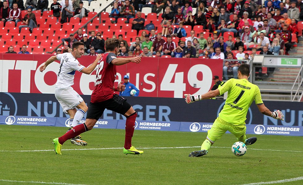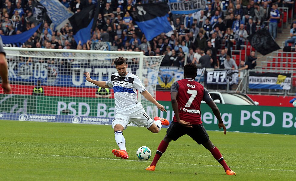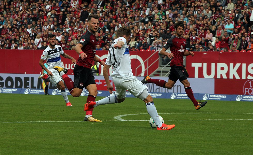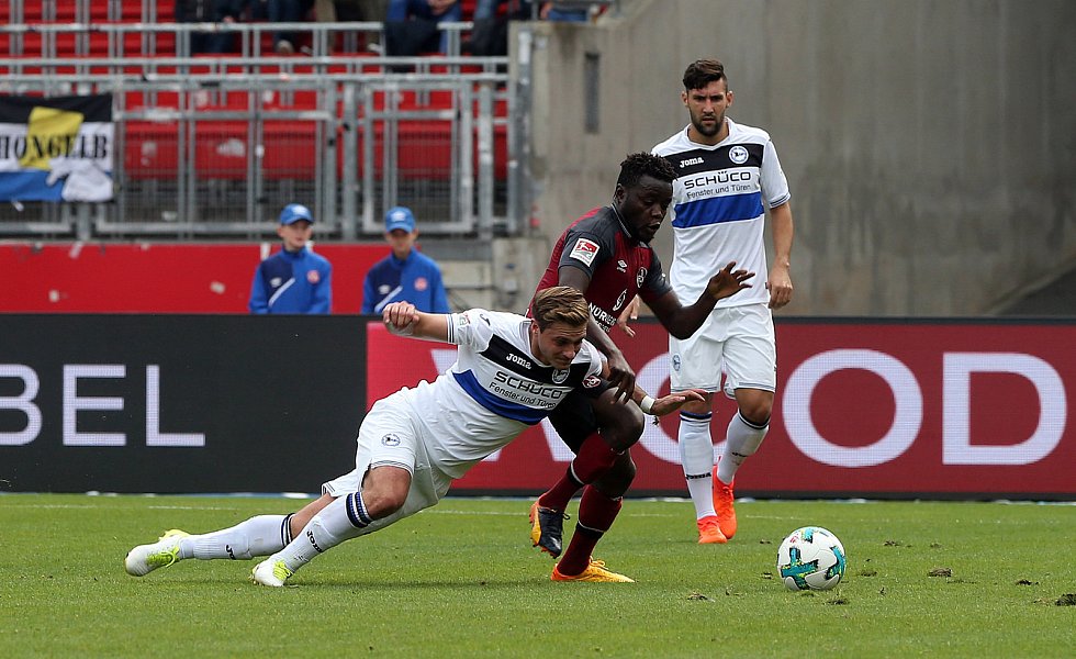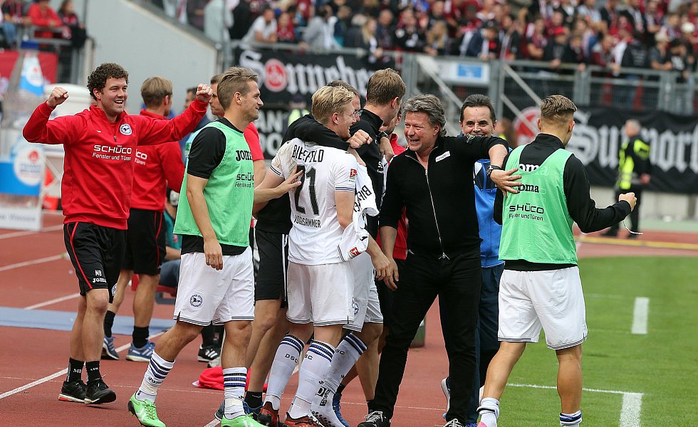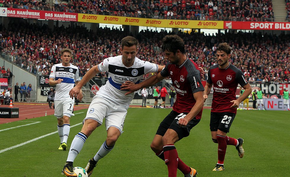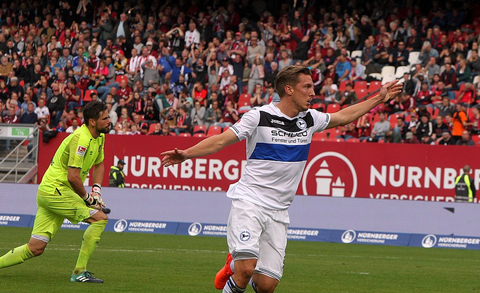 Bielefeld/Nürnberg. Arminia Bielefeld springt durch einen 2:1-Auswärtssieg beim 1. FC Nürnberg auf den dritten Tabellenplatz und beißt sich in der Spitzengruppe der zweiten Liga weiter fest. Zwei Joker-Tore durch Andraz Sporar und Konstantin Kerschbaumer waren in einer chancenreichen Partie ausschlaggend für den Erfolg. Kurz vor dem Pausenpfiff musste Christoph Hemlein verletzt ausgewechselt werden, nachdem er ohne gegnerische Einwirkung umgeknickt war.