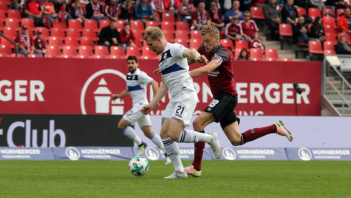 In der Folge probierten sich auf Nürnberger Seite Valentini (31.) und Löwen (35.) und auf Bielefelder Seite Patrick Weihrauch (38.) aus der Distanz, zielten aber jeweils zu ungenau. Mit fortschreitender Spielzeit nahm die Qualität des Spiels zunehmend ab. Zwar zeigten sich beide Mannschaften defensiv stabil, konnten sich mit ihrem statischen Aufbauspiel aber so gut wie keine Torchancen erspielen. Kurz vor dem Pausenpfiff trat Nürnbergs Salli mit einem eher harmlosen Kopfball in Erscheinung, bevor Arminias Hemlein im Zweikampf mit Ewerthon ohne gegnerische Einwirkung umknickte und den Platz humpelnd verlassen musste. Für ihn kam Keanu Staude in die Partie.