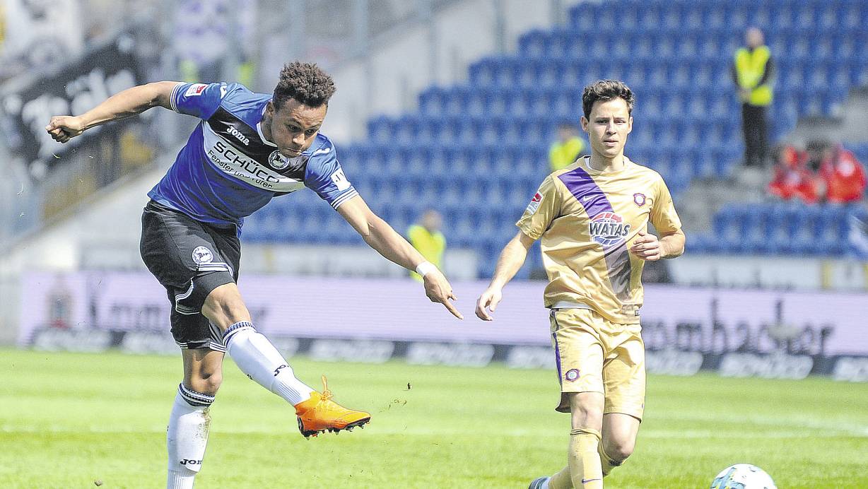 Wohl bald bei einem Bundesligisten: Arminias Talent Roberto Massimo (l.) schießt im Spiel gegen Aue aufs Tor.  | © Christian Weische