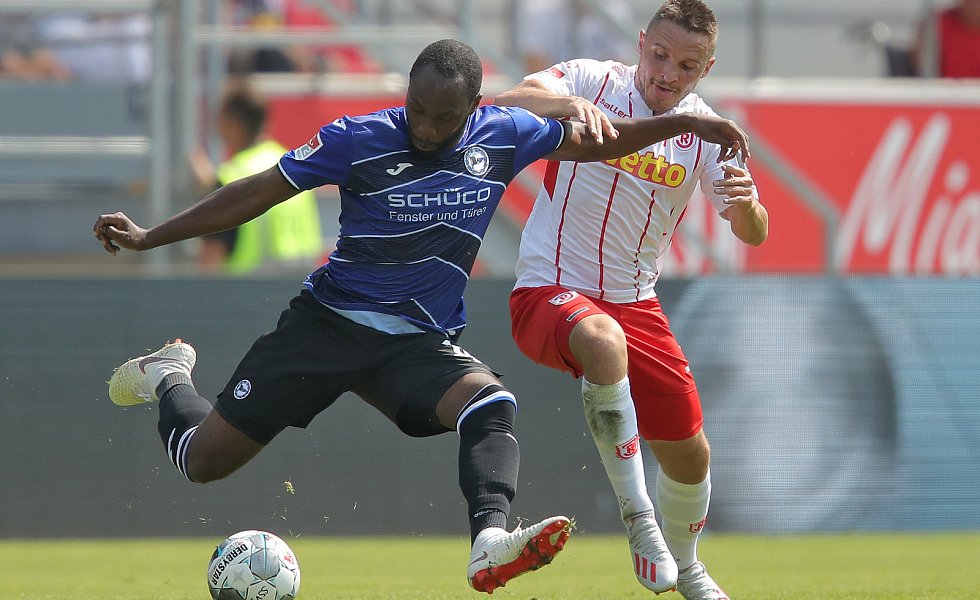 Der Trainer hatte dieselbe Startelf ins Rennen geschickt, die am vergangenen Sonntag gegen Aue beim 3:1-Heimsieg auf dem Platz stand. Das Spiel nahm für die Arminen dennoch einen schlechten Anfang: Nach fünf Minuten musste Neuhaus bereits das erste Mal wechseln, weil Brian Behrendt sich am Knie verletzt hatte. Für ihn kam Amos Pieper. Doch die Arminen ließen sich von diesem Wechsel nicht aus dem Konzept bringen und übernahmen von Beginn an das Kommando. Nach acht Minuten die erste große Chance zur Führung: Andreas Voglsammer stibitzte Saller auf der linken Seite den Ball und legte in den Rücken zu Klos, der über den Ball lief und für Yabo durchließ. Der kam aus 15 Metern frei zum Schuss, zielte aber deutlich über das Gehäuse.