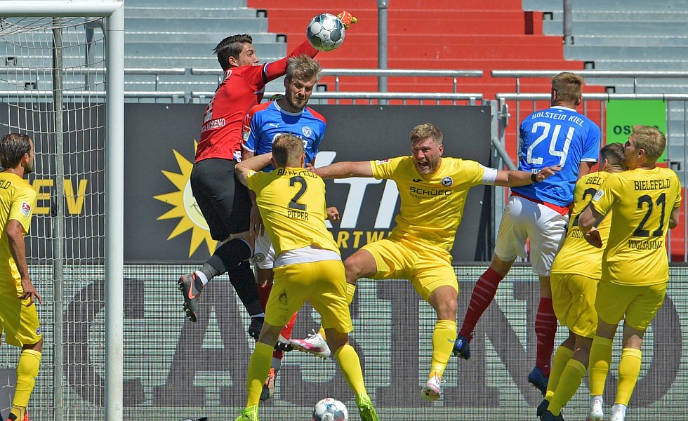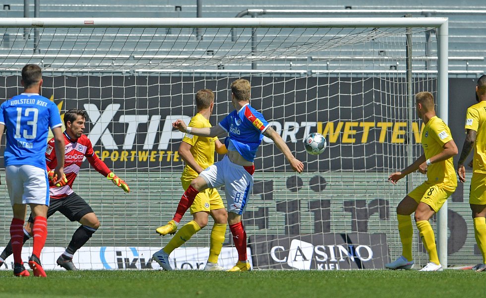 Der eingewechselte Reese wird links im Sechzehner nicht konsequent genug bedrängt und chipt den Ball in die Mitte. Dort steigt Mühling am Höchsten und nickt rechts unten zum 1:1 ein (49.). Mit der ersten richtigen Chance glichen die Kieler direkt aus, die fortan wesentlich besser im Spiel waren. Die Arminen kamen aus dem Takt und hatten Glück, nicht in Rückstand zu geraten: