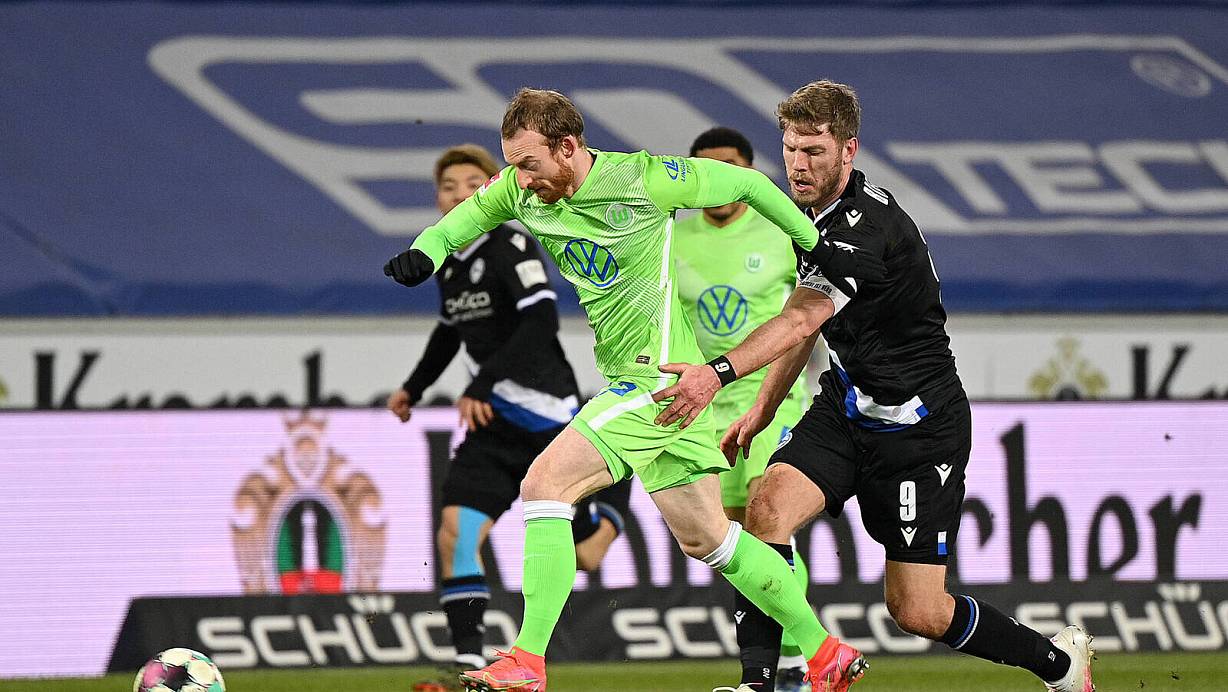 Im Februar siegte der VfL Wolfsburg um Maximilian Arnold (l., im Duell mit Fabian Klos) mit 3:0 bei der Arminia. Im Unterschied zu damals dürfen Fans jetzt wieder dabei sein. Doch die Beschränkungen nehmen zu, je höher sich die vierte Viruswelle türmt. Foto: imago images | © imago images/Ulrich Hufnagel