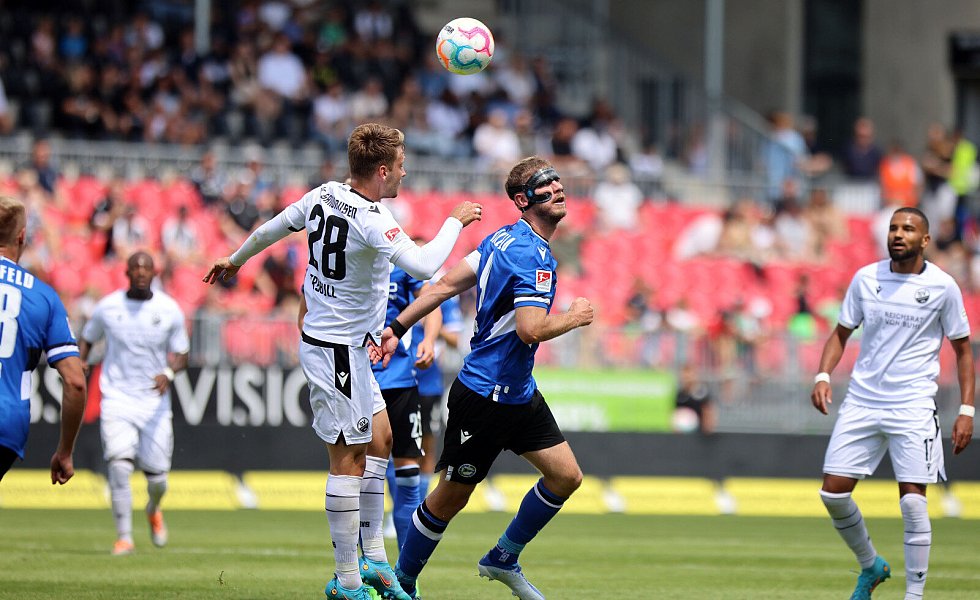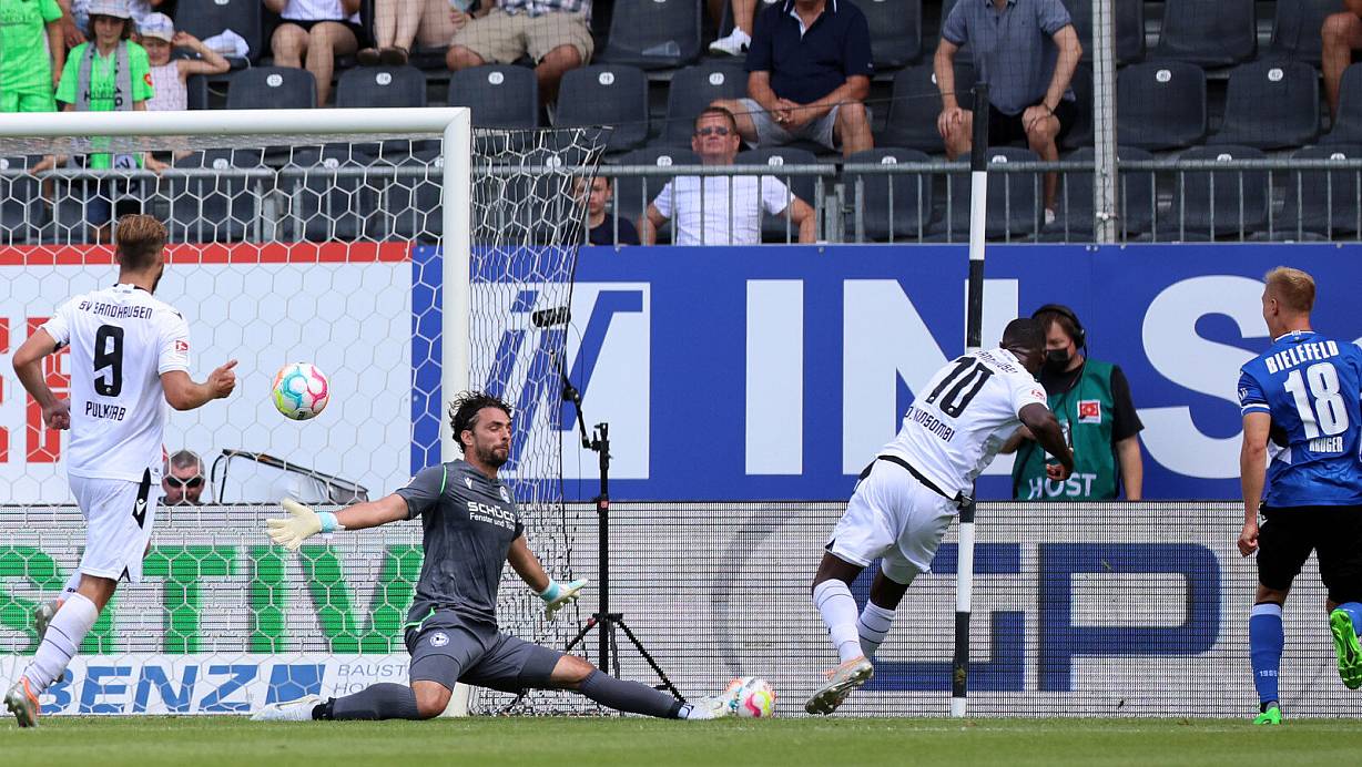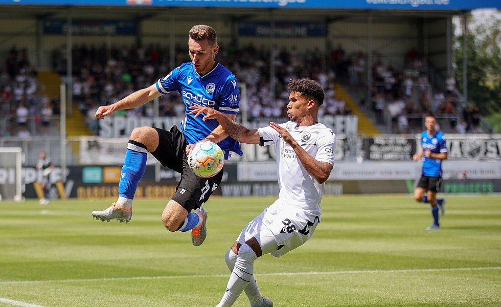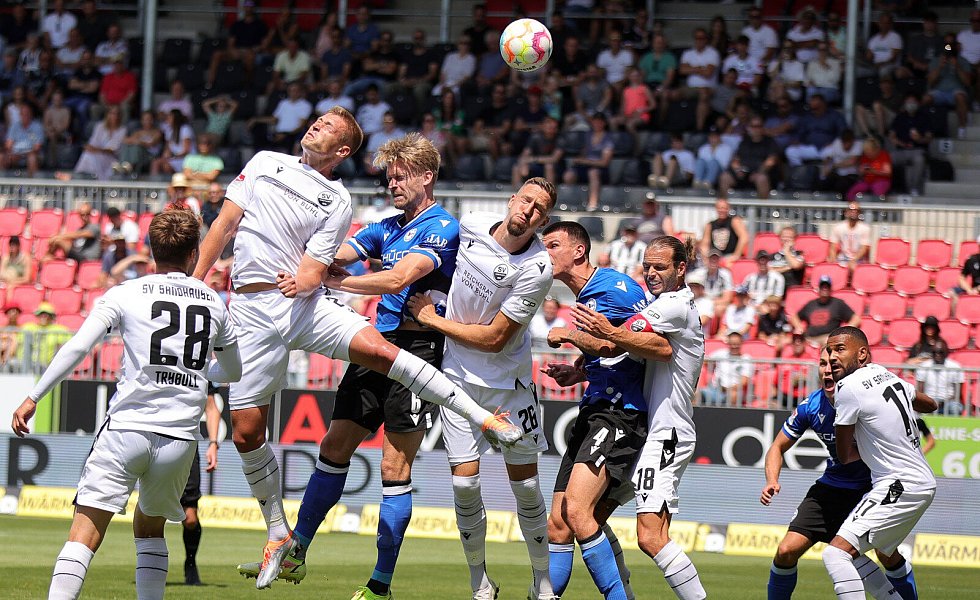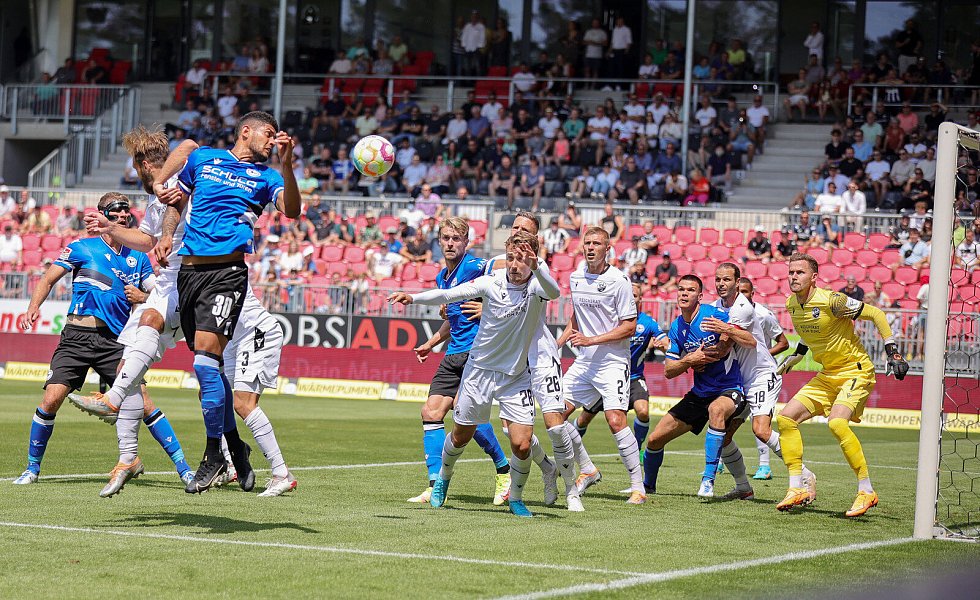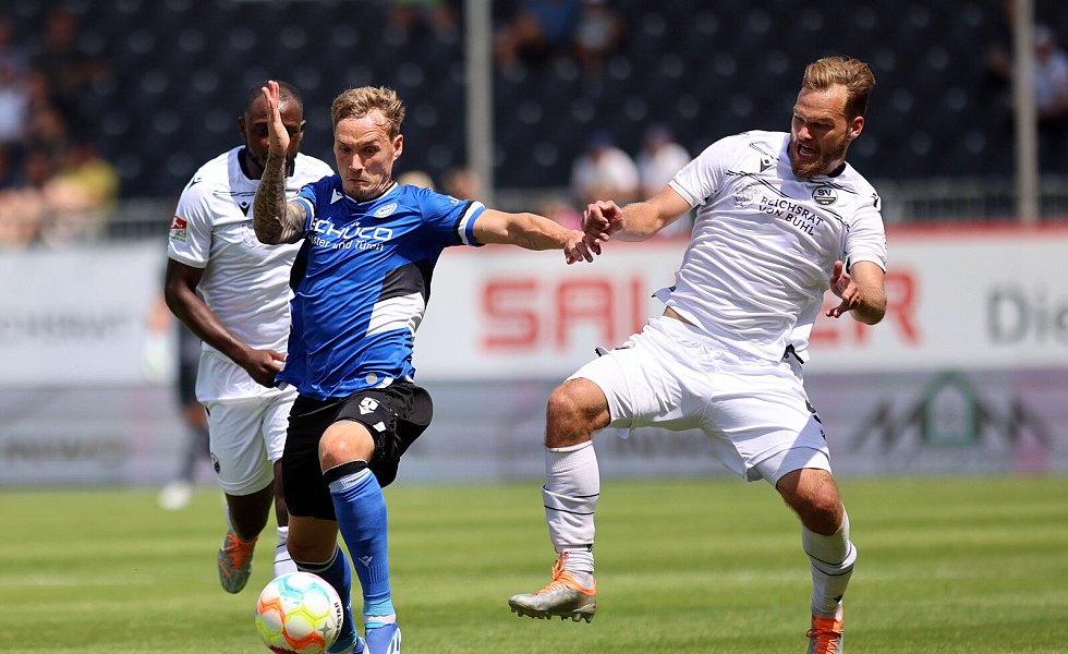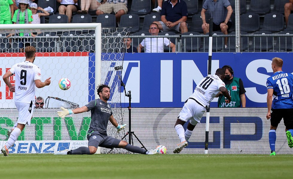 Eine Doppelchance zur Bielefelder Führung hatten Silvan Sidler und Krüger. Laursen hatte den Ball links auf Robin Hack im Strafraum weitergeleitet, der zu Sidler zurücklegte. Der Schweizer köpfte gegen die Laufrichtung des Keepers, aber Patrick Drewes im SVS-Tor konnte abwehren. Den zweiten Ball brachte Krüger per Drehschuss auf den Kasten - Latte (10.).
