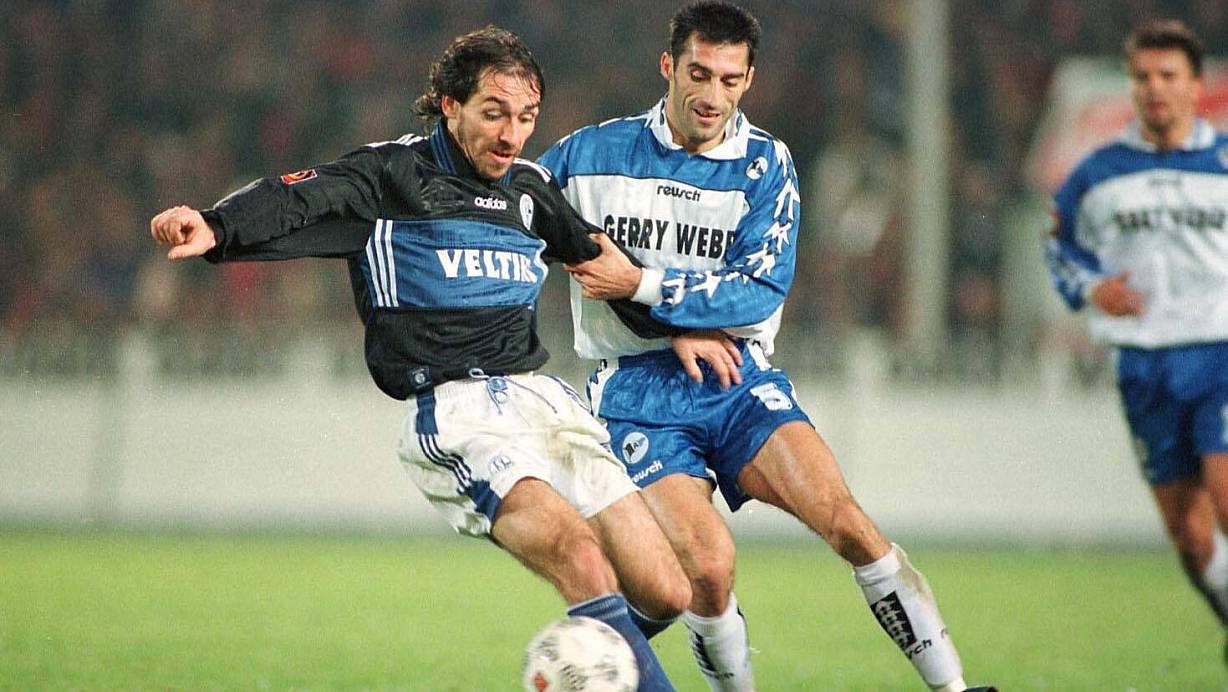 Arminia Bielefelds Thomas Stratos (r.) versucht beim 1:1 gegen Schalke 04 in der Bundesligasaison 1997/1998, den Schalker Jiri Nemec zu stoppen. | © imago sportfotodienst