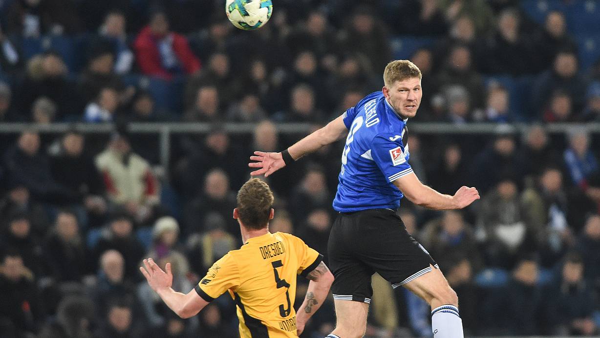 Fabian Klos (r., hier beim Kopfballduell gegen Dresdens Manuel Konrad im Februar 2018) ist bis auf zwei Unterbrechungen seit der Saison 2014/2015 Kapitän von Arminia Bielefeld. | © Christian Weische