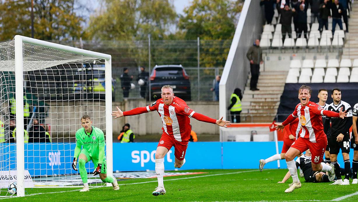 Die 90. Minute: Essens Ron Berlinski (Mitte) feiert seinen Treffer zum 2:1, Arminia Bielefeld um Torwart Jonas Kersken (l.) ist geschlagen. | © IMAGO/Markus Endberg