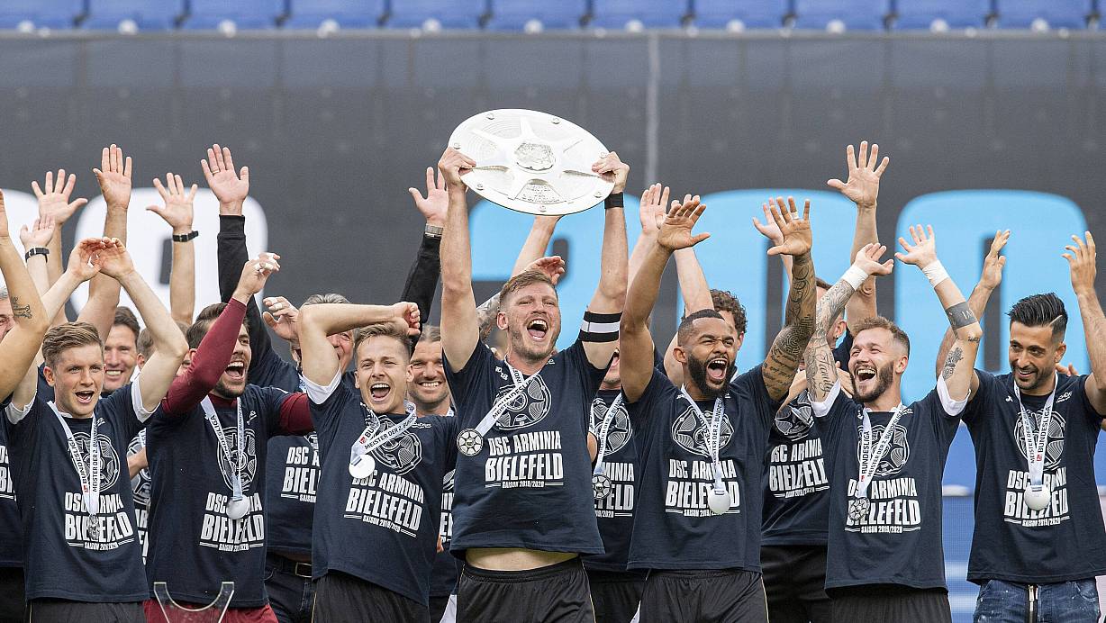Der größte Erfolg: Fabian Klos (M.) stemmt als Kapitän von Arminia Bielefeld die Meisterschale der 2. Bundesliga in die Höhe. | © imago images/Sven Simon
