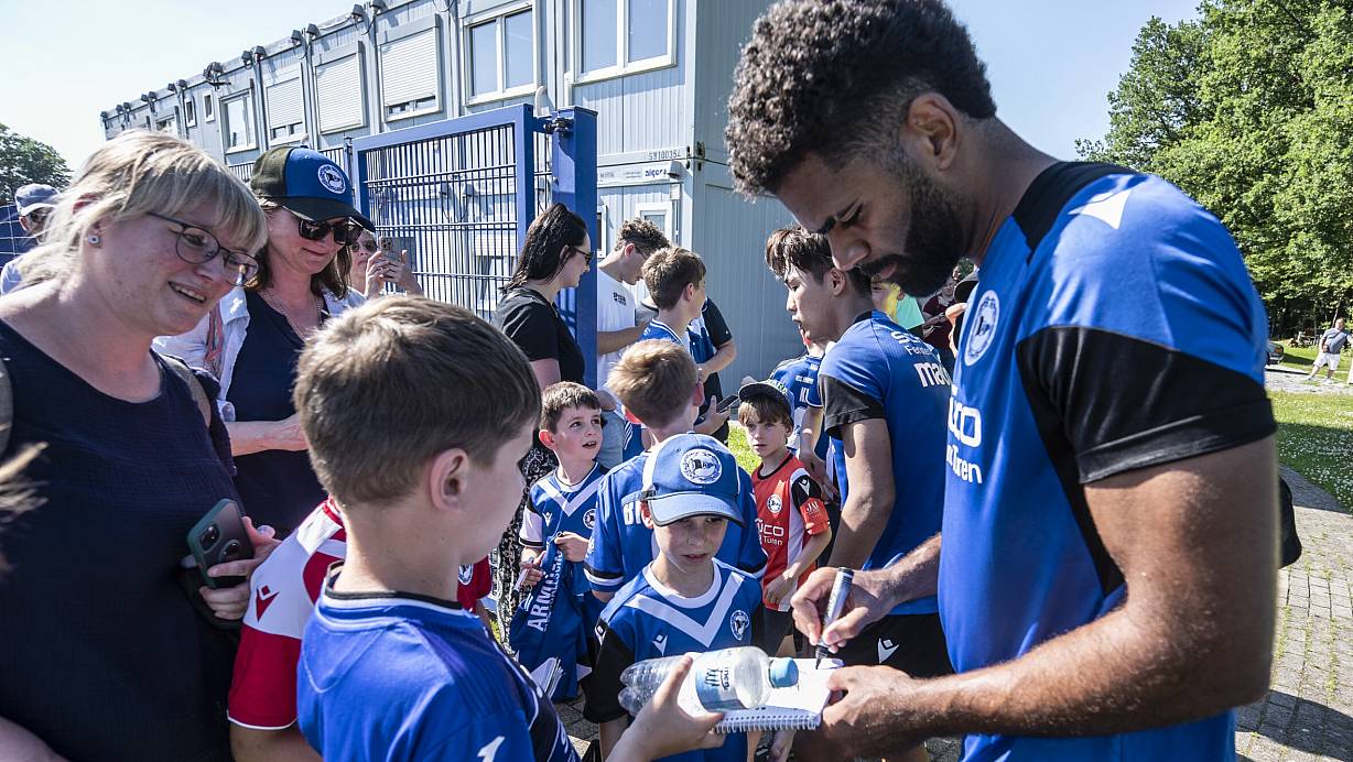 Neuzugang André Becker trägt Arminias Vereinslogo "mit einem gewissen Stolz", wie er sagt. Hier schreibt er nach dem Training Autogramme. | © Jörg Dieckmann