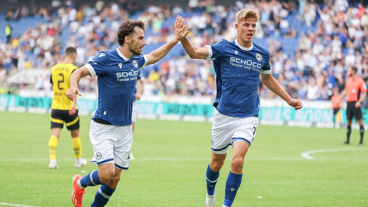 Julian Kania (r.), hier mit Christopher Lannert, will bald auch über die eigenen Tore im Arminia-Dress jubeln. | © Oliver Krato