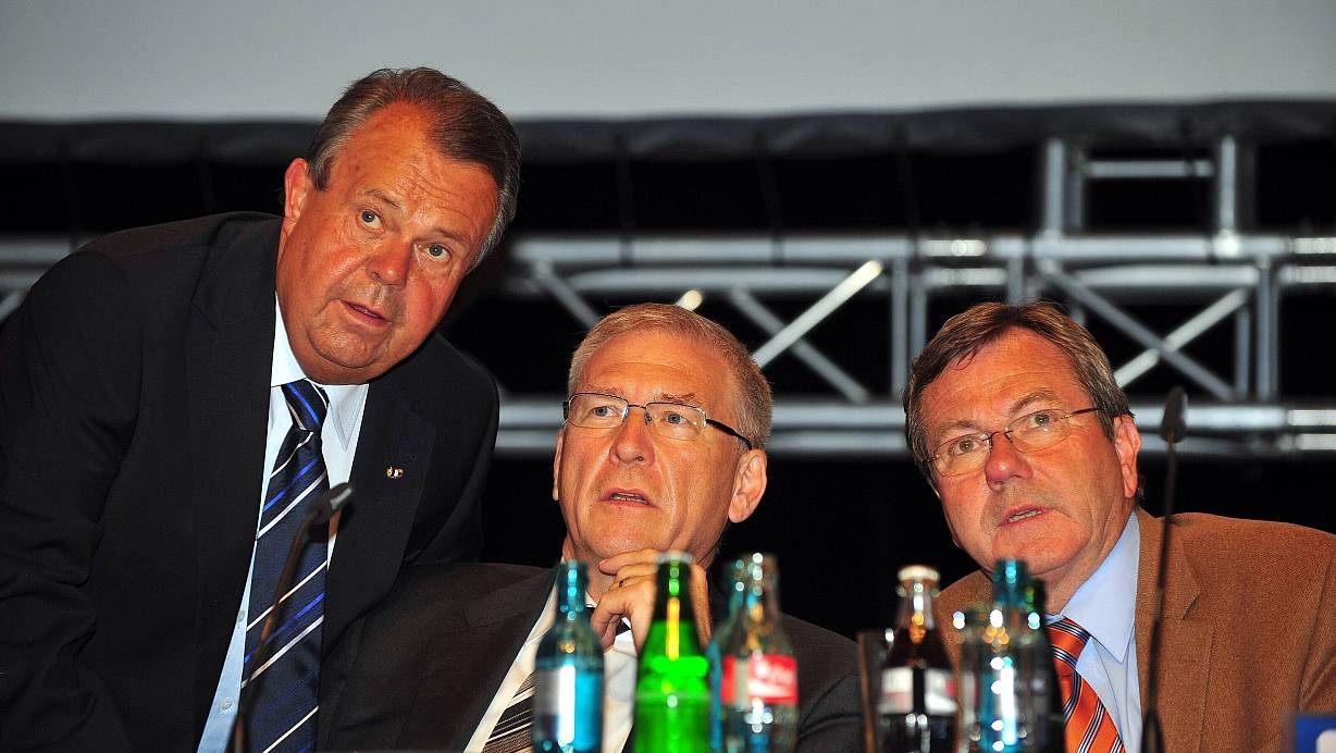 Bis 2009 war Albrecht Lämmchen (l.) im Vorstand von Arminia Bielefeld aktiv. Hier tauscht er sich auf der Mitgliederversammlung 2009 mit Versammlungsleiter Michael Vesper und dem Vorstandskollegen Jochen Willmann aus. | © imago sportfotodienst