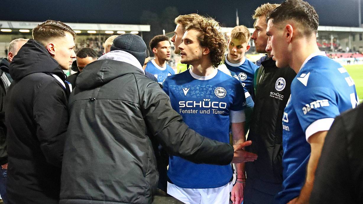 Im Anschluss an das 0:1 in Sandhausen stellen sich die Arminia-Profis Mael Corboz, Joel Grodowski und Stefano Russo (v. l.) den mitgereisten Fans. | © IMAGO/Jan Huebner