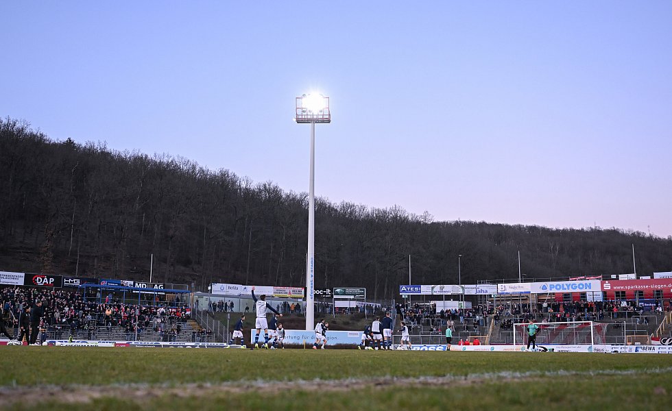 Der Außenseiter diktierte die Anfangsphase, präsentierte sich mutig und ließ Arminia zunächst nicht zur Entfaltung kommen. Vielleicht lag die vornehme Zurückhaltung des Favoriten auch daran, dass die Stimmungsmacher unter den Gästefans erst mit Verspätung im Block eintrafen. Gesungen wurde in Siegen abgesehen von der Vereinshymne des Gastgebers („Wir sind die Freunde“) darum erst nach rund einer Viertelstunde.