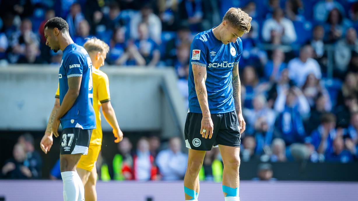 Die Arminen Jonny Grodowski (r.) und Noah Sarenren Bazee lassen nach der Niederlage die Köpfe hängen. | © Sarah Jonek