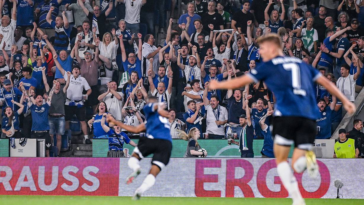 Die DSC-Spieler bejubeln das 1:0 gegen den SV Werder. Die Fans feiern – bis auf zwei Promis in Reihe sieben. Ansgar Brinkmann und Arnd Zeigler. Der Kult-Moderator präsentierte das Foto am Sonntag in seiner Sendung. | © Teresa Kröger