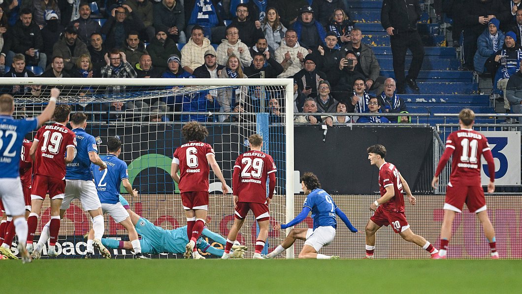 Vieles, wenn nicht alles, deutete nach 25-minütiger Dominanz der Hausherren darauf hin, dass die Arminen an diesem Samstagabend als chancenloser Verlierer vom Platz gehen würden. Doch der Aufsteiger schlug aus dem Nichts zurück. Einen weiten Einwurf verlängerte Joel Felix auf Noah Sarenren Bazee, der den Ball rechts im Strafraum annahm und aus der Drehung ansatzlos zum 1:1-Ausgleich in die Maschen drosch (28.).