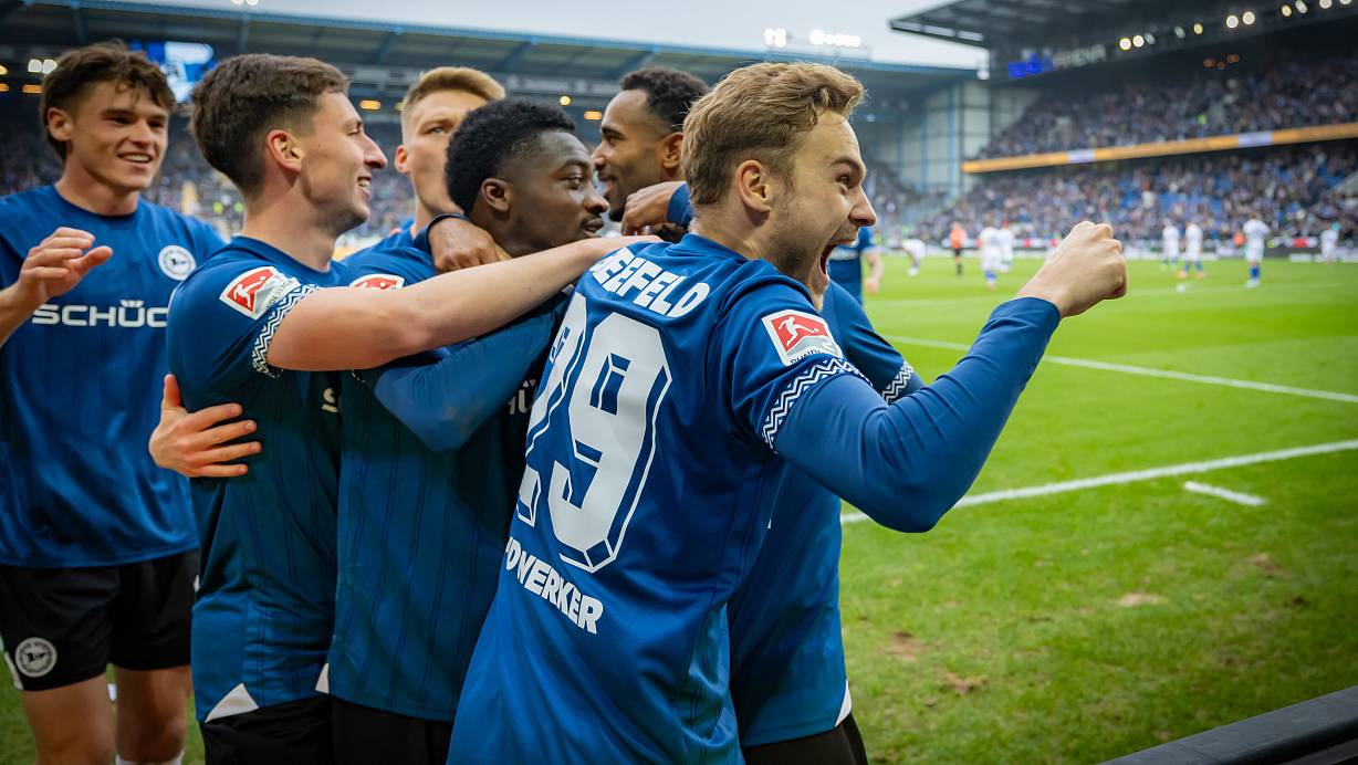 Die Bielefelder Großer, Wörl, Schneider, Momuluh, Sarenren Bazze und Handwerker (v. l.) feiern ausgelassen den 4:0-Kantersieg gegen den Karlsruher SC. | © Sarah Jonek