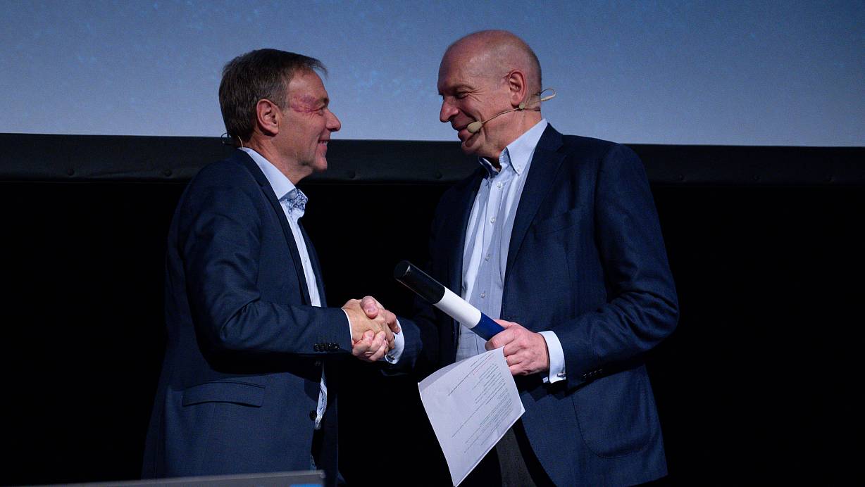 Rainer Schütte (r.) übergibt den symbolischen Staffelstab des Arminia-Präsidenten an seinen Nachfolger Rainer Kobusch. | © Teresa Kroeger