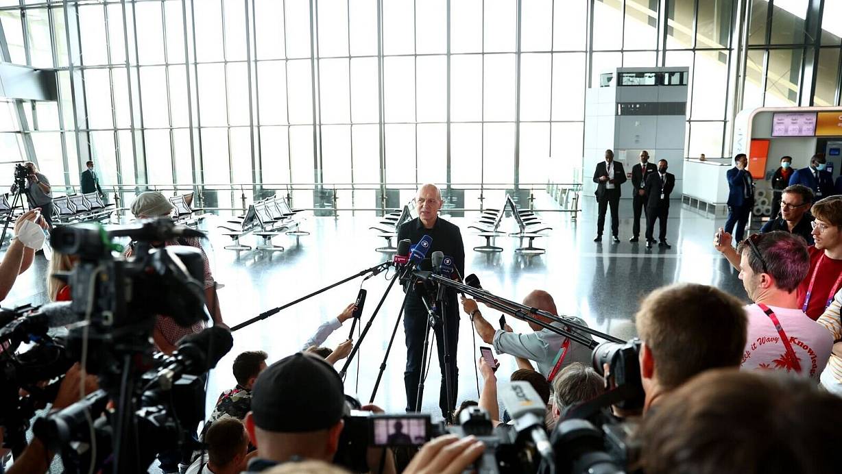 «Herzlich willkommen, meine Damen und Herren vor dem Abflug heute. Sie können sich vorstellen, dass der Verlauf des gestrigen Tages für uns eine herbe Enttäuschung ist. Das Ausscheiden aus dem Turnier schmerzt außerordentlich. Wir müssen trotzdem den Blick nach vorne richten und werden deshalb ein geordnetes Verfahren einleiten, wie wir mit dieser Situation umgehen. Ein geordnetes Verfahren, das bedeutet, dass wir einen Fahrplan entwickelt haben. Dieser Fahrplan sieht vor, dass wir uns in der kommenden Woche zusammensetzen werden. Das bedeutet Hansi Flick, das bedeutet Oliver Bierhoff, Aki Watzke und meine Person. Es wird ein erstes Treffen sein, wo wir besprechen werden, wie die Situation sich darstellt.