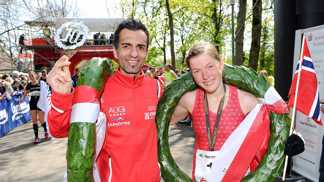 Die Sieger: Elias Sansar gewinnt zum 10. Mal den Hermannslauf, Hilde Aders zum dritten Mal. | © Christian Weische