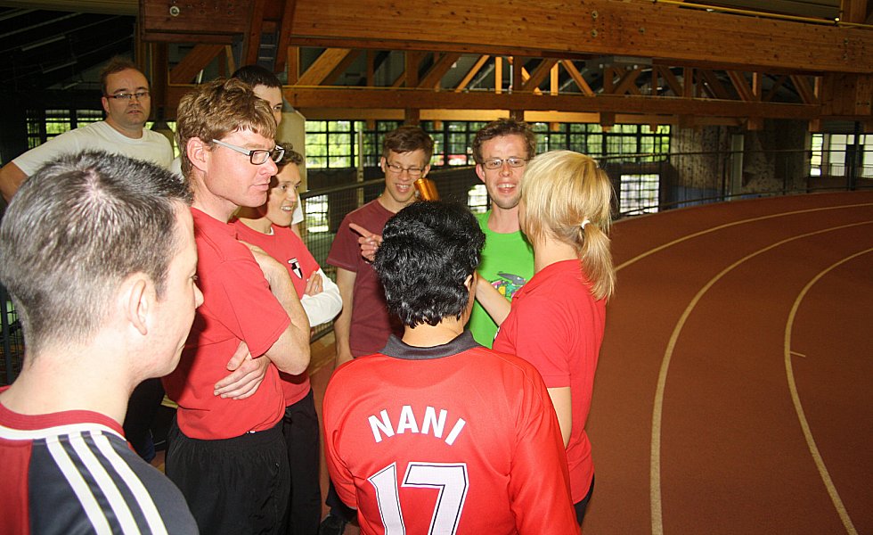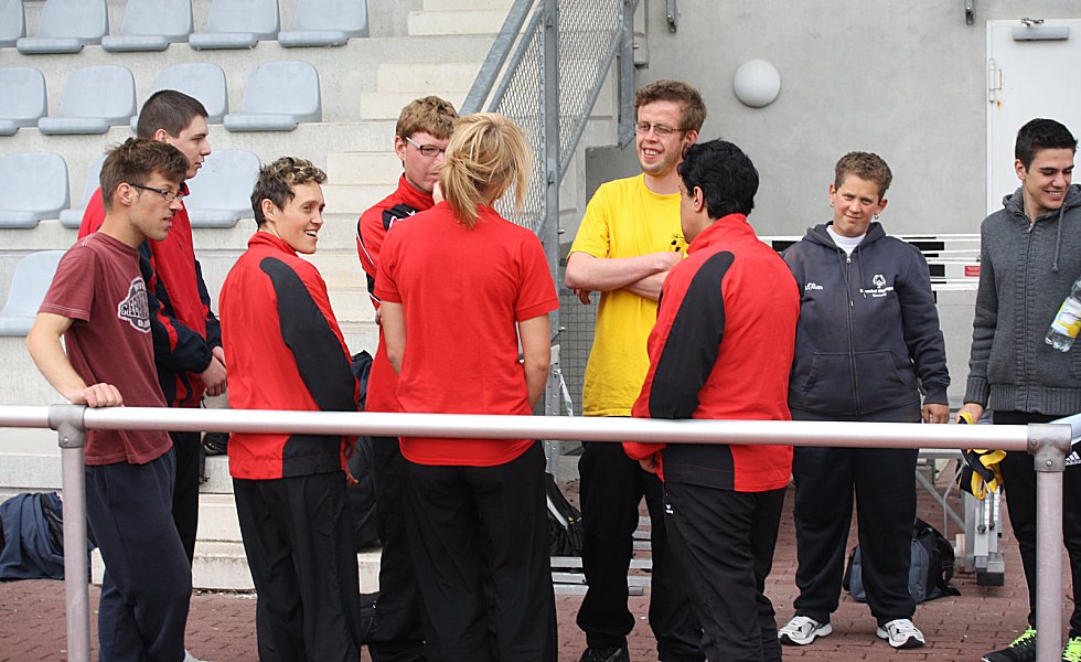 Auf dem Gelände des Ahorn-Sportparks führen sie mit den geistig behinderten Sportlern ein "ziemlich strukturiertes Training" durch - streng nach Leichtathletik-Regeln, wie Maike Beilfuß erklärt: "Wir laufen uns erst warm und dehnen uns. Anschließend führen wir eine Koordinationsübung durch und gehen dann in den technischen Bereich über", beschreibt die Trainerin.