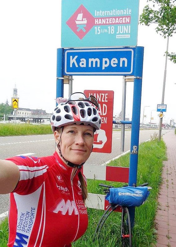 Angekommen: Nach 210 Kilometern Tagesfahrt mit dem Sportroller erreichte Martina Uekermann die Stadtgrenze von Kampen, Gastgeber der "Hanzedagen". | © Privat