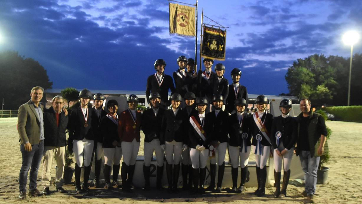 Siegerehrung in der Dämmerung: Vlothos Bürgermeister Rocco Wilken (l.) und der Vereinsvorsitzende Hans-Herbert Obermowe (2. v. l.) gratulierten dem Team des RV „von Bismarck“ Exter zum Gewinn der Kreisstandarte. | © Arne-Christian Sigge