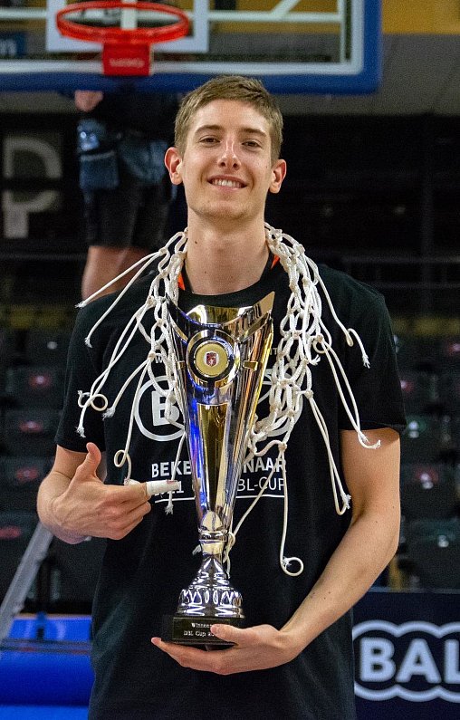 Der Bielefelder Neil Masnic präsentiert stolz die Trophäe für den niederländischen Basketball-Pokalsieger BAL Weert. - © Tessa Van Gameten