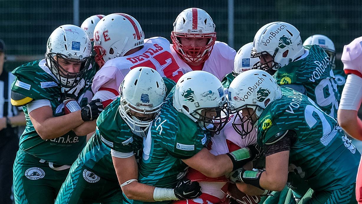 „Wir freuen uns natürlich, dass es endlich wieder losgehen soll. Besonders für unsere Fans, die schon mit den Füßen scharren“, sagt Vorstandsmitglied Heiko Schreiber. Er sieht allerdings noch einen „Kraftakt“ bezüglich Planung und Organisation der Spiele auf die Bulldogs zukommen. „Wir haben knapp 40 Tage, um alles auf die Reihe zu bekommen.“ Der Verband hat einen vorläufigen Spielplan herausgegeben. Wie erwartet wird es eine einfache Runde geben. Die Bulldogs müssen drei Mal auswärts ran und haben zwei Heimspiele. „Bei unseren Terminen auf der Rußheide müssen wir uns mit dem VfB Fichte absprechen. Es darf nur eine Mannschaft je Wochenende auf den Rasen“, erklärt Schreiber.