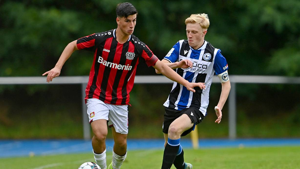 Arminias Jan Luka Kollmeier attackiert den ballführenden Leverkusener Arda Suene. Foto: Starke | © Thomas F. Starke