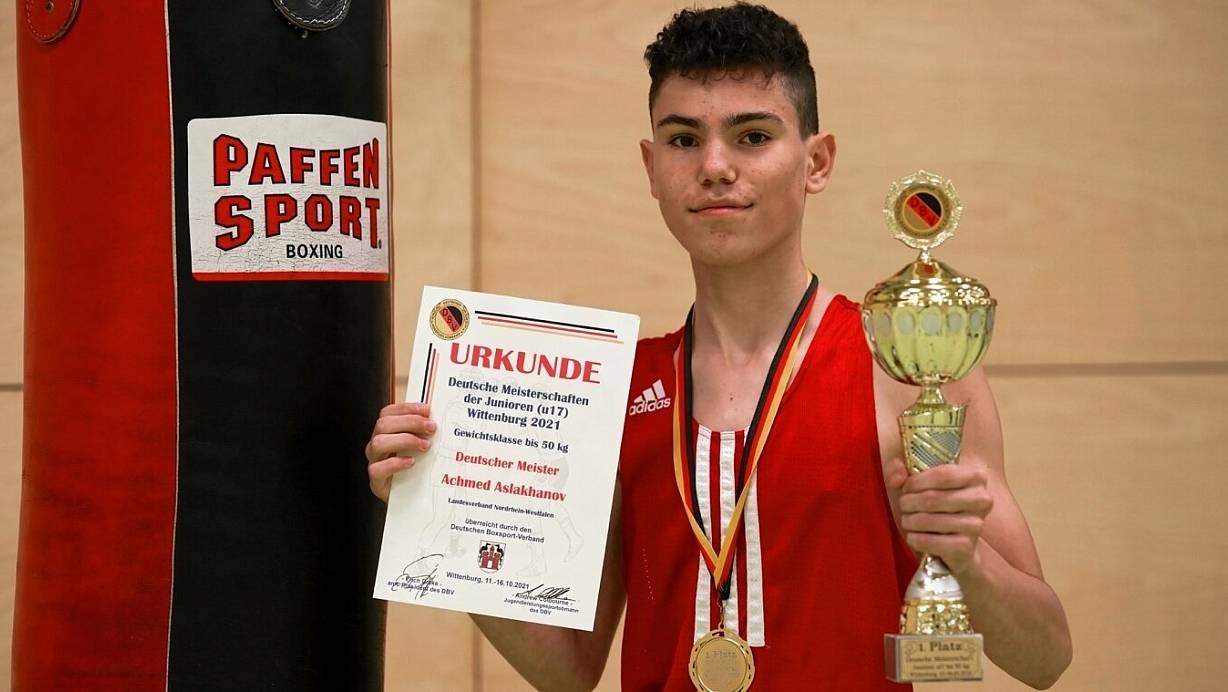 Bielefeld (-per-). Nach dem Titelgewinn bei den Landesmeisterschaften in Köln trumpfte Achmed Aslakhanov auch bei den Deutschen Juniorenmeisterschaften (U 17) groß auf. In Wittenberg feierte das erst 15-jährige Box-Talent des BC Vorwärts ungefährdete Erfolge. „Drei 5:0-Punktsiege sprechen eine deutliche Sprache“, resümierte BCV-Coach Alexander Bich: „Mit so einer starken Leistung kann sich Achmed auch berechtigte Hoffnungen auf eine Teilnahme bei EM- und WM-Titelkämpfen machen.“