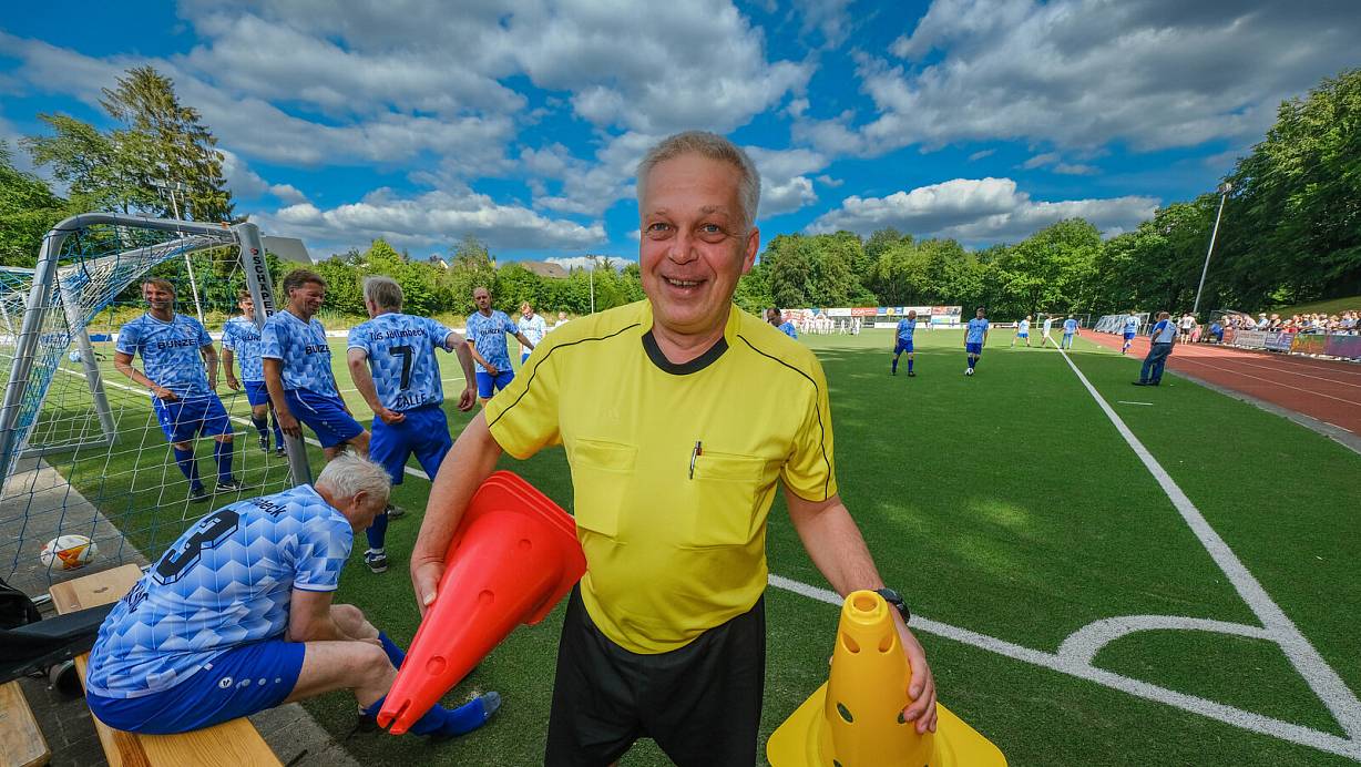 Schiri Klaus Münstermann tauschte die Rote und Gelbe Karte gegen entsprechendfarbige Hütchen. | © Andreas Zobe