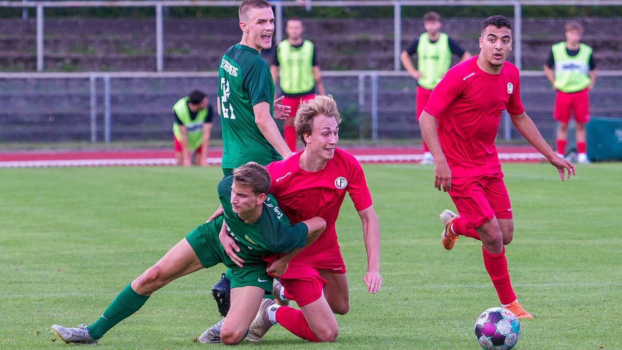 Im Ringen um Ball und Sieg: Fichtes Garon Zeibig bringt Dornbergs Lukas Kuck (am Boden) zu Fall. Rechts beobachtet der spätere Torschütze der Hüpker, Mourad El Hamdaoui, die Szene. | © Andreas Zobe