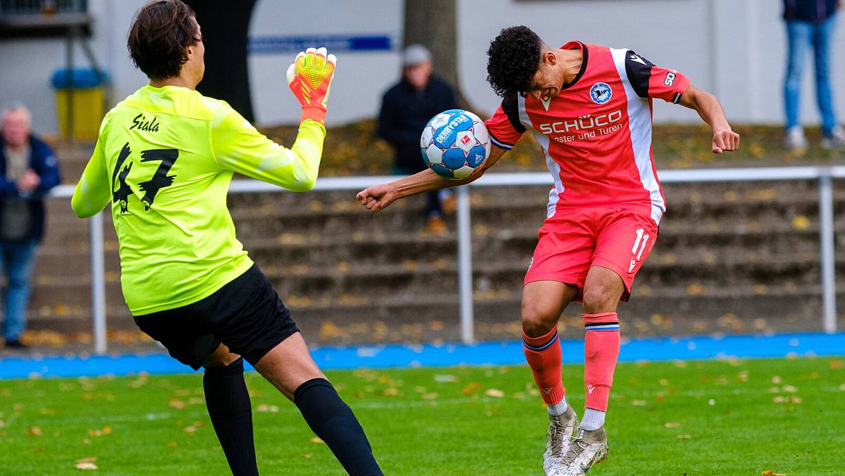 Arminia Bielefelds Ayoube Amaimouni-Echghouyab versucht’s mit einem Kopfball gegen Waltrops Torhüter. | © Andreas Zobe