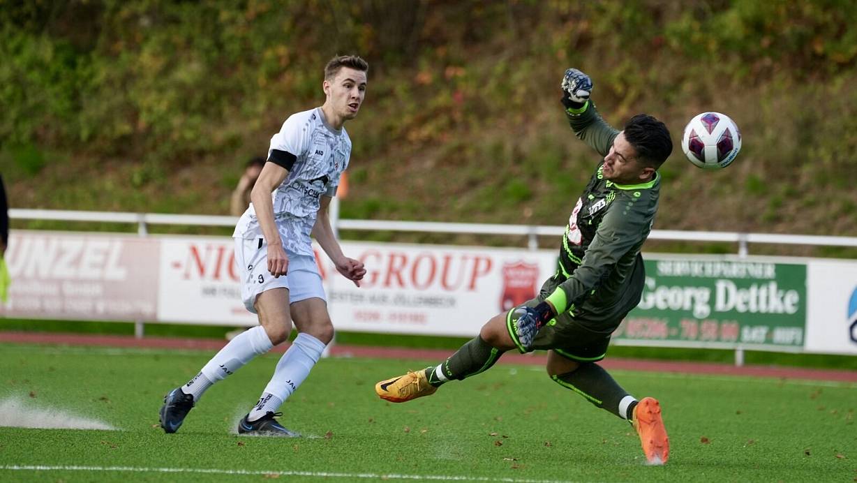 Drin! TuS Jöllenbecks Lennart Koch trifft zum 1:0 gegen Türk Sports Torhüter Anil Sirin. Am Ende steht ein 3:1. | © Peter Unger
