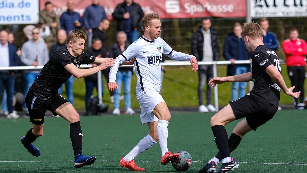 Dornbergs Mitja Schierbaum (Mitte) wird von den Theesenern Julian Stratoff (l.) und Fynn Stuckenholz attackiert. | © Andreas Zobe