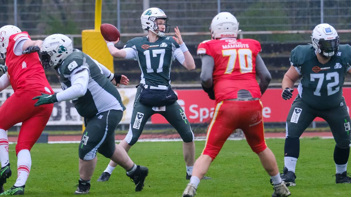 Im zweiten Testspiel hat sich die Offense der Bulldogs mit Quarterback Luis Altehoefer ( Nr. 17) schon verbessert gezeigt. | © Andreas Zobe