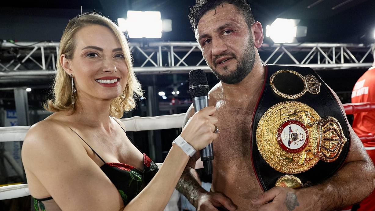 Moderatorin Sarah Valentina Winkhaus spricht im Ring mit dem erfolgreichen Titelverteidiger Leon Harth. | © Peter Unger