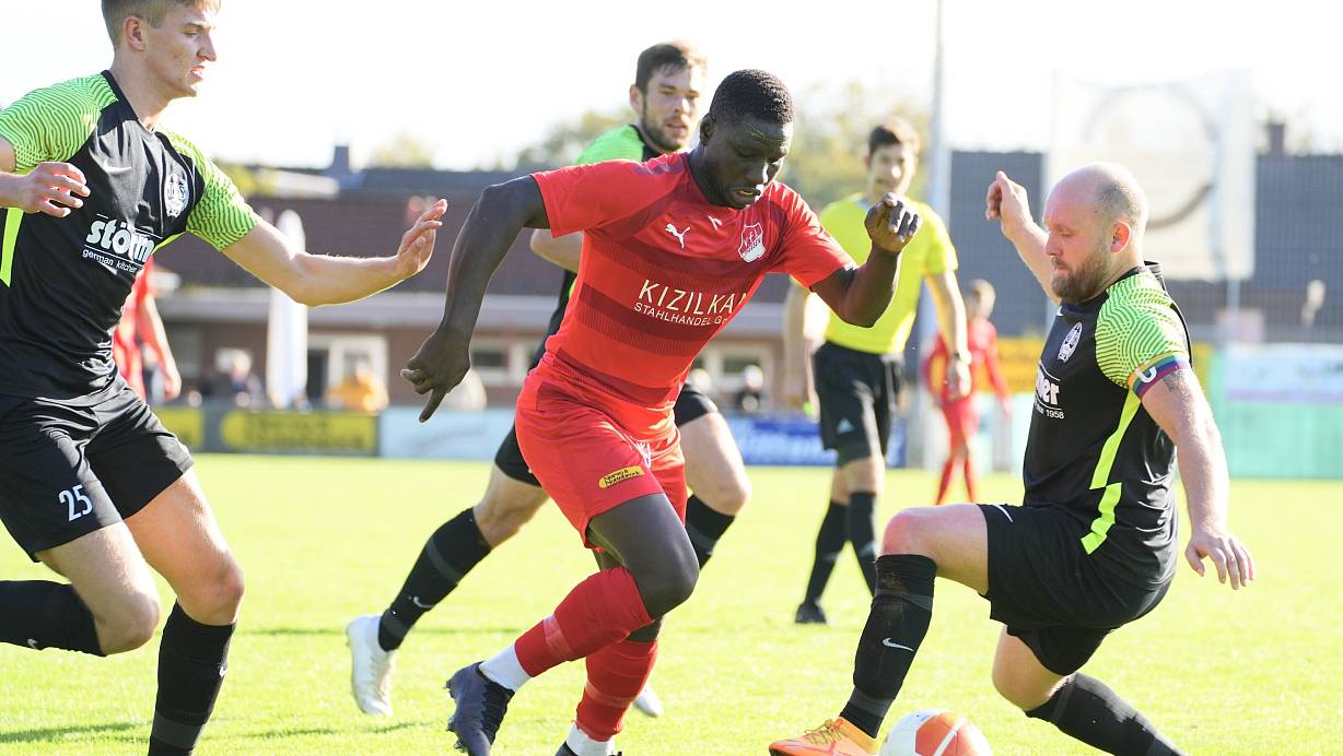 Theesens Yatma Wade (rotes Trikot) ist auf dem Weg zu einem seiner insgesamt 29 Tore, die er für den VfL geschossen hat. | © Peter Unger